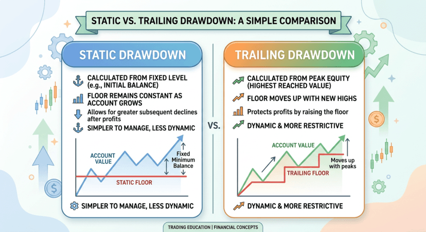 Daily drawdown is a per-day limit. But most prop firms also enforce an overall (maximum) drawdown, and this is where static versus trailing comes into play.