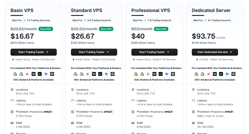 Cloudzy’s raw hardware—NVMe storage, DDR5 RAM, 4.2+ GHz processors—looks excellent for the price. But general cloud hosting providers miss several key features required by forex traders: specialized infrastructure positioned inside the same financial data centers as brokers, guaranteed uptime during trading hours, and support that understands trading software and terminology.