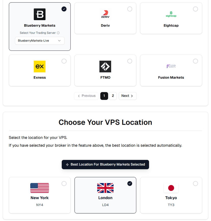 More importantly, we provide a broker latency checker that shows actual latency from our servers to specific brokers before you purchase. Select your broker, see the latency, choose your location accordingly.