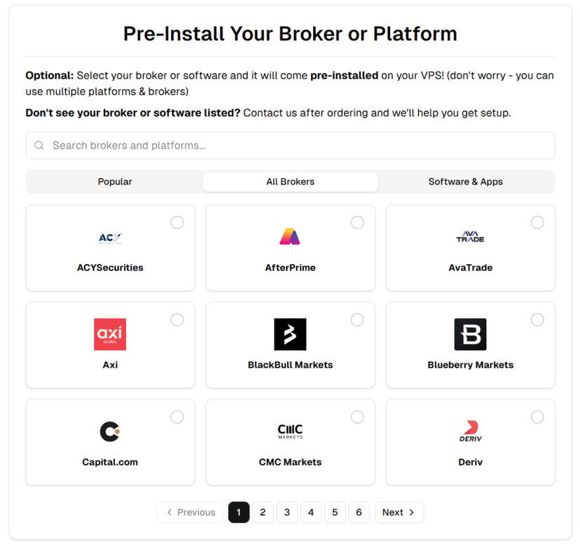 Every VPS ships pre-configured with your selected broker’s trading platform. Choose your broker at checkout, and your VPS arrives ready to trade—no manual installation required.