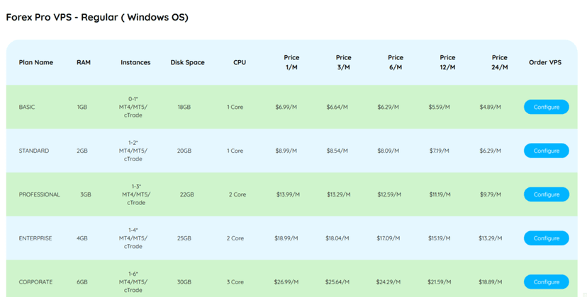 - FXVPSPro’s entry plan has only 1GB RAM and HDD storage — Windows Server alone consumes most of this, leaving minimal headroom for trading platforms.