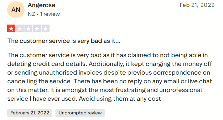 “The customer service is very bad as it has claimed to not being able in deleting credit card details. Additionally, it kept charging the money off or sending unauthorised invoices despite previous correspondence on cancelling the service. There has been no reply on any email or live chat on this matter.”— Trustpilot review