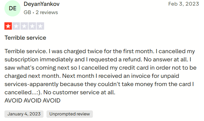 “Terrible service. I was charged twice for the first month. I cancelled my subscription immediately and I requested a refund. No answer at all. I saw what’s coming next so I cancelled my credit card in order not to be charged next month.”— Trustpilot review