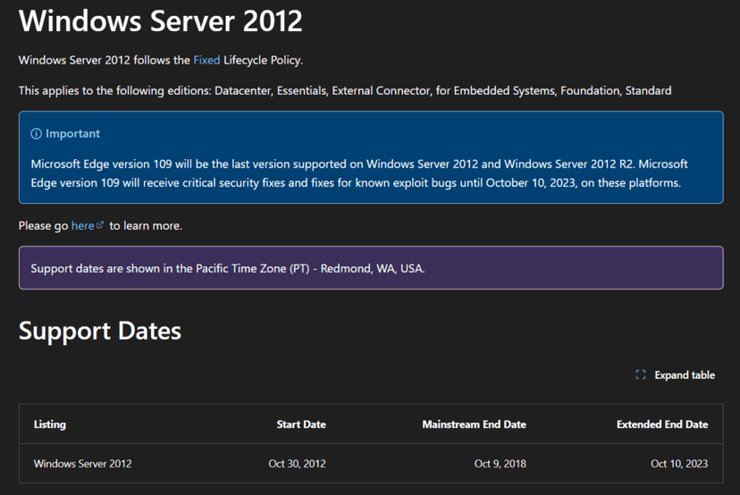 - Windows Server 2012: Extended support ended October 2023. No longer receives security updates.